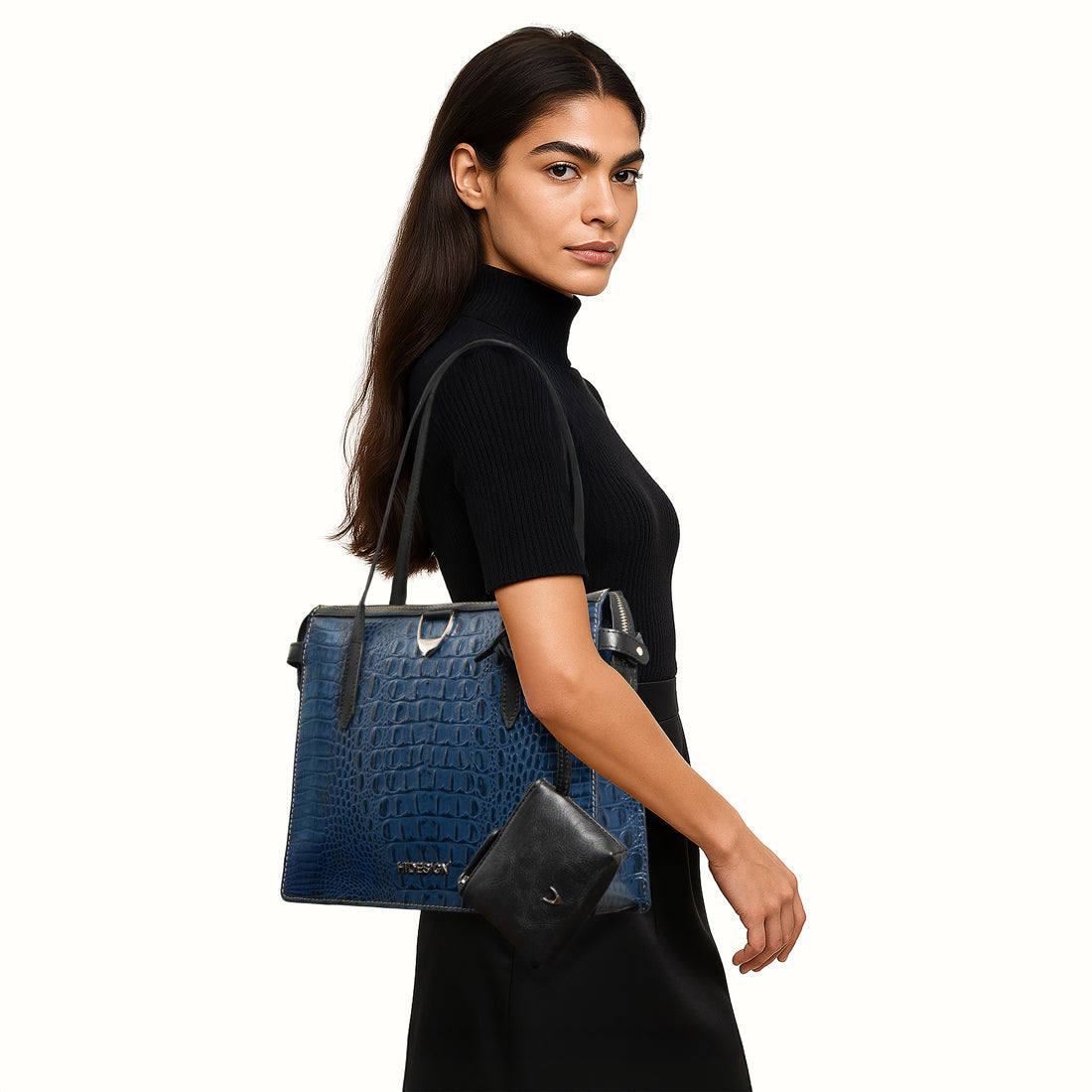Meet Sabrina 01, your refined work tote. Crafted in Baby Croco leather, Sabrina 01 offers a spacious, organised interior with a central zip compartment, back slip pocket, and a detachable coin pouch for added versatility. Designed to fit a 13” iPad, it carries your workday essentials with ease, finished with contrast stitching and the signature horn logo for an artisanal touch.