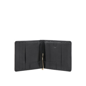 Open view of men's black bi-fold leather wallet with sleek compartments for cards by Hidesign.