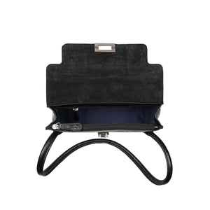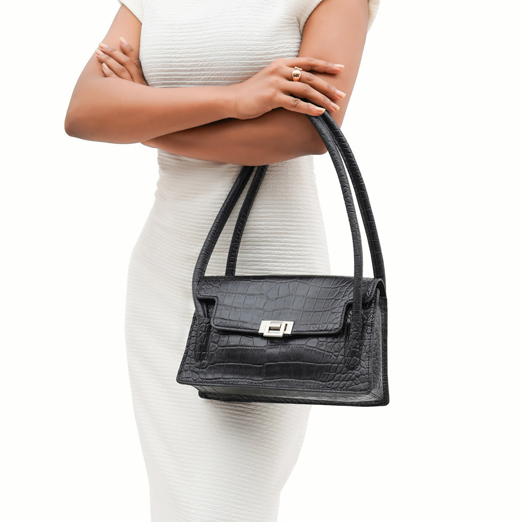 - Note: The model is 5 feet tall; please refer to the dimensions for the accurate bag or wallet size.