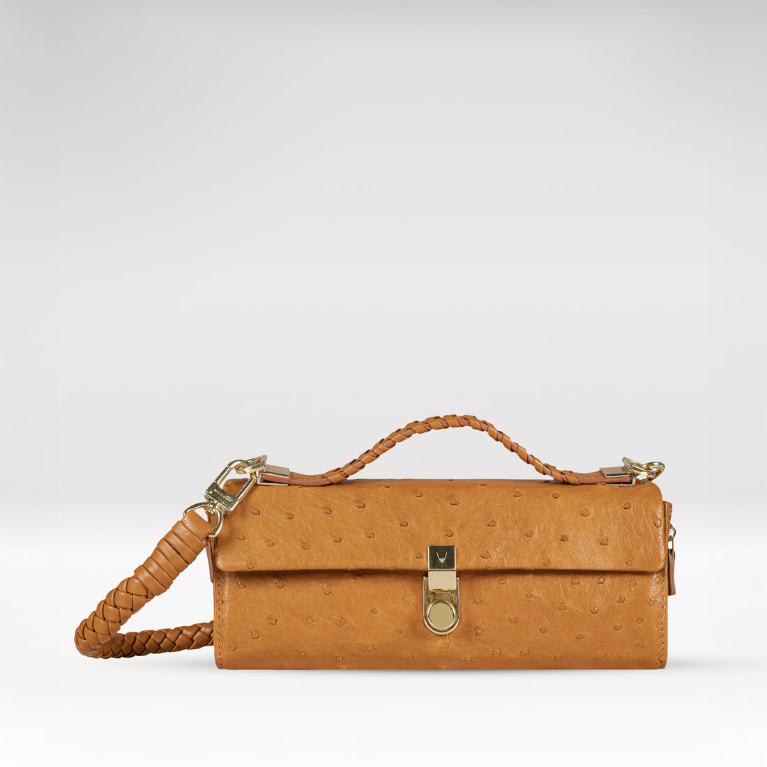 Flap closure with gold-plated turn lock featuring the signature horn logo.