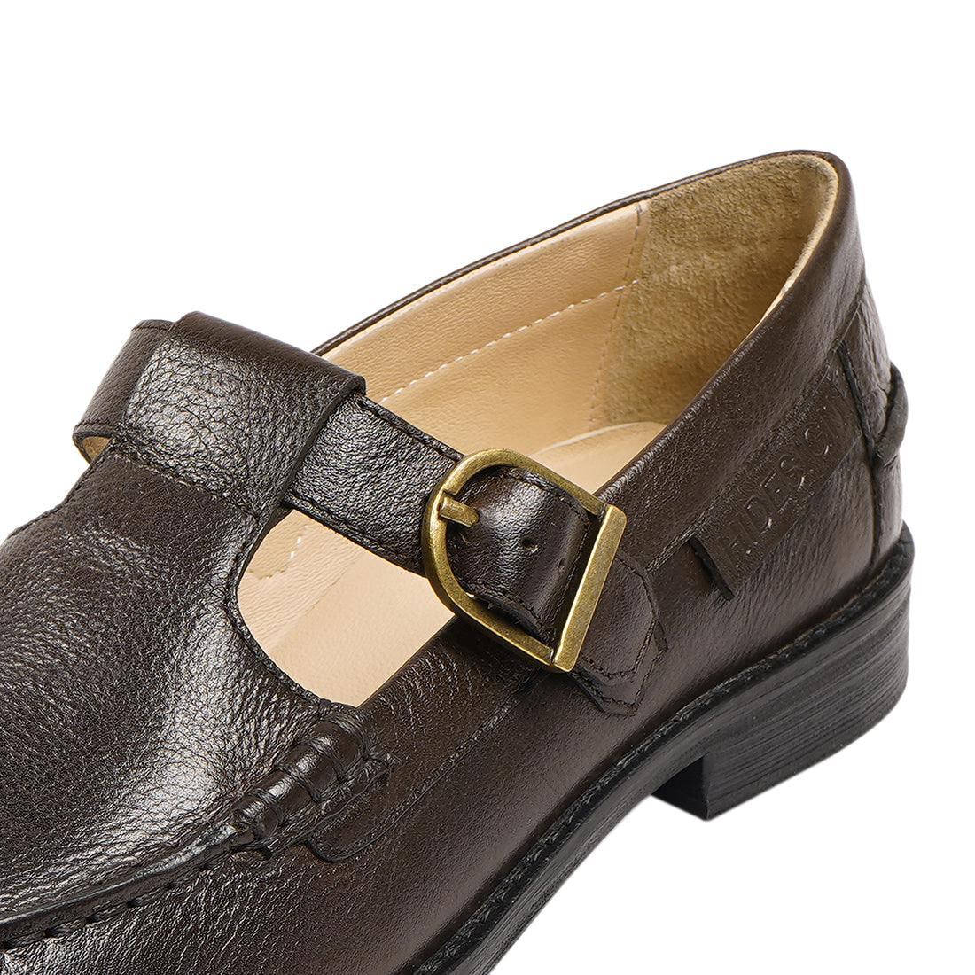- Handcrafted T-Bar Mary Jane sandal with moccasin stitch detail