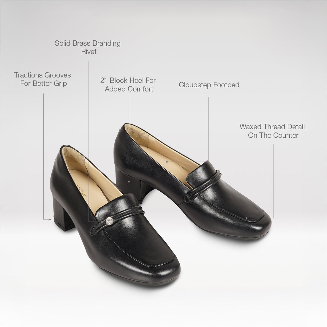 This handcrafted loafer is elevated with a sculpted 2-inch block heel, intricate hand-stitched detailing in waxed thread, and our signature solid brass rivet.
