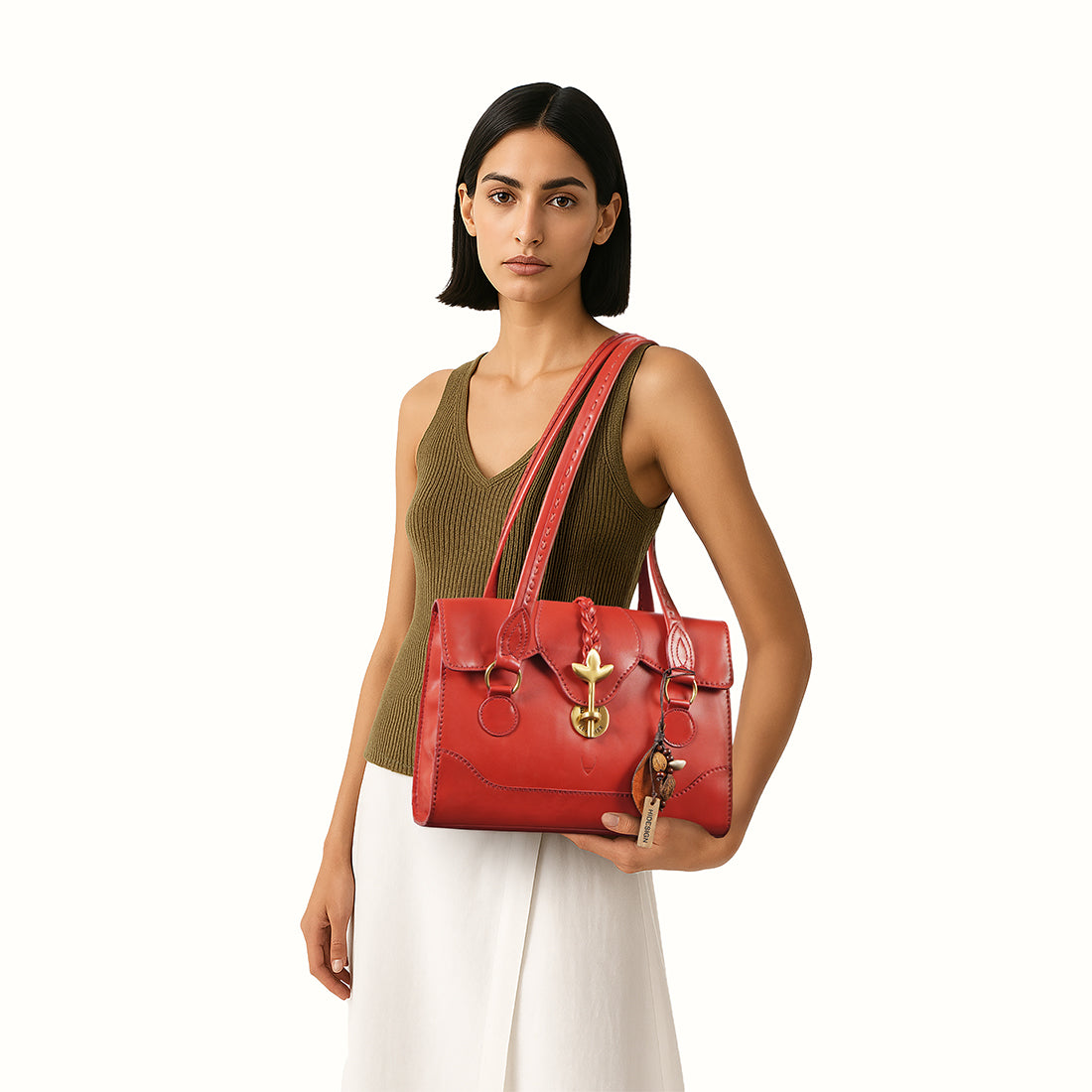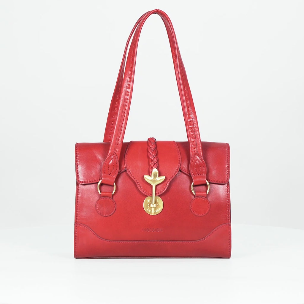 Say hello to Clover 02, a shoulder bag from Hidesign's East India Collection. It's handcrafted the slow, sustainable way, using East India Leather, tanned with native seeds and barks. The bold brass lock brings a striking edge, while the leather weaving and stitch-detailed straps lend it a soft, handcrafted charm. And with a back slip pocket for your phone or keys, it's designed to keep up with life.