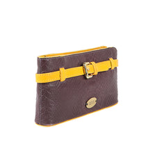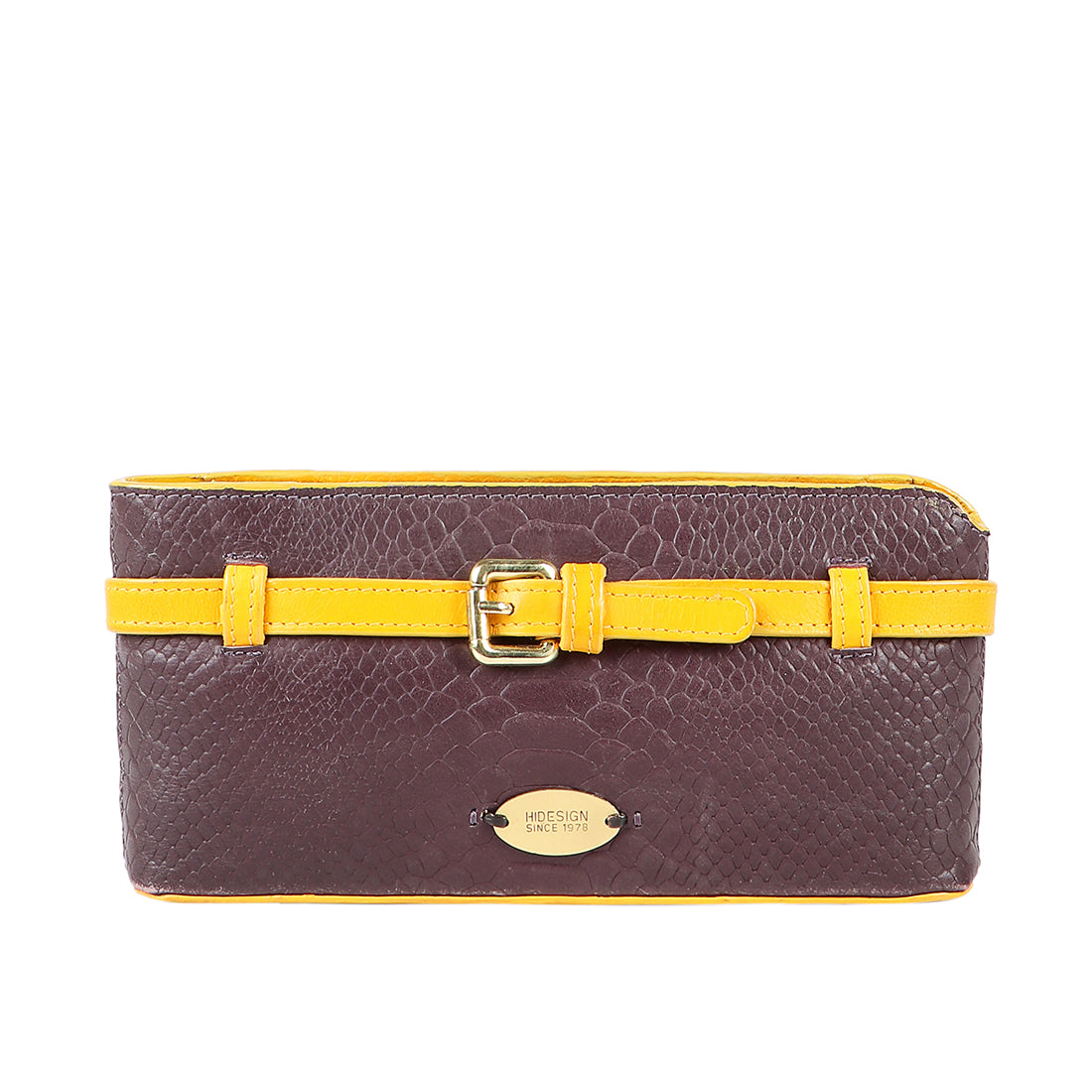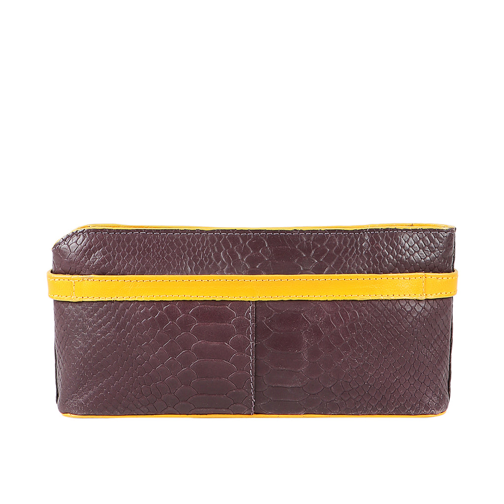 The beautiful snake embossed clutch with belt and buckle detail will keep you in vogue.