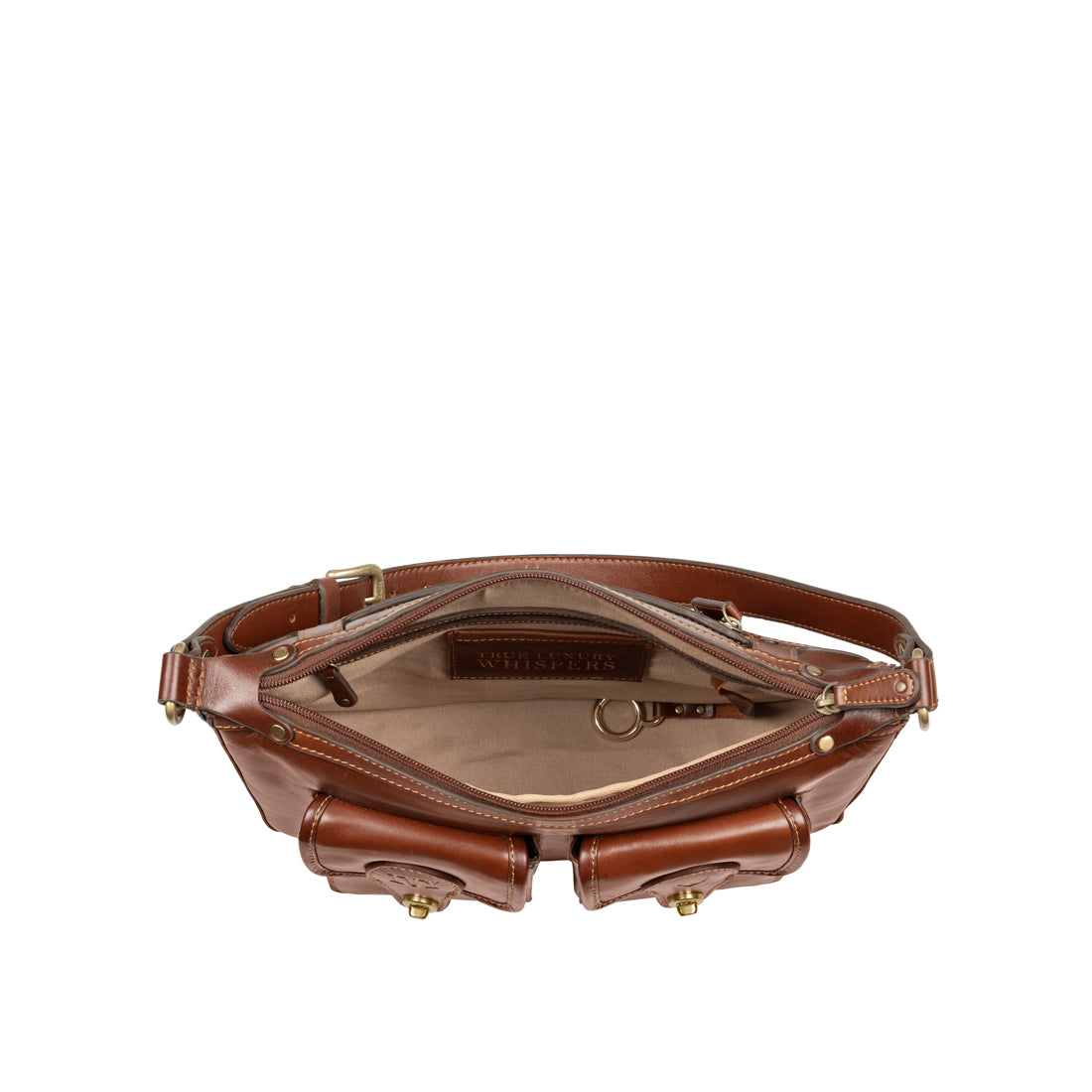Adjustable leather shoulder strap with solid brass fittings for durability and ease of wear.