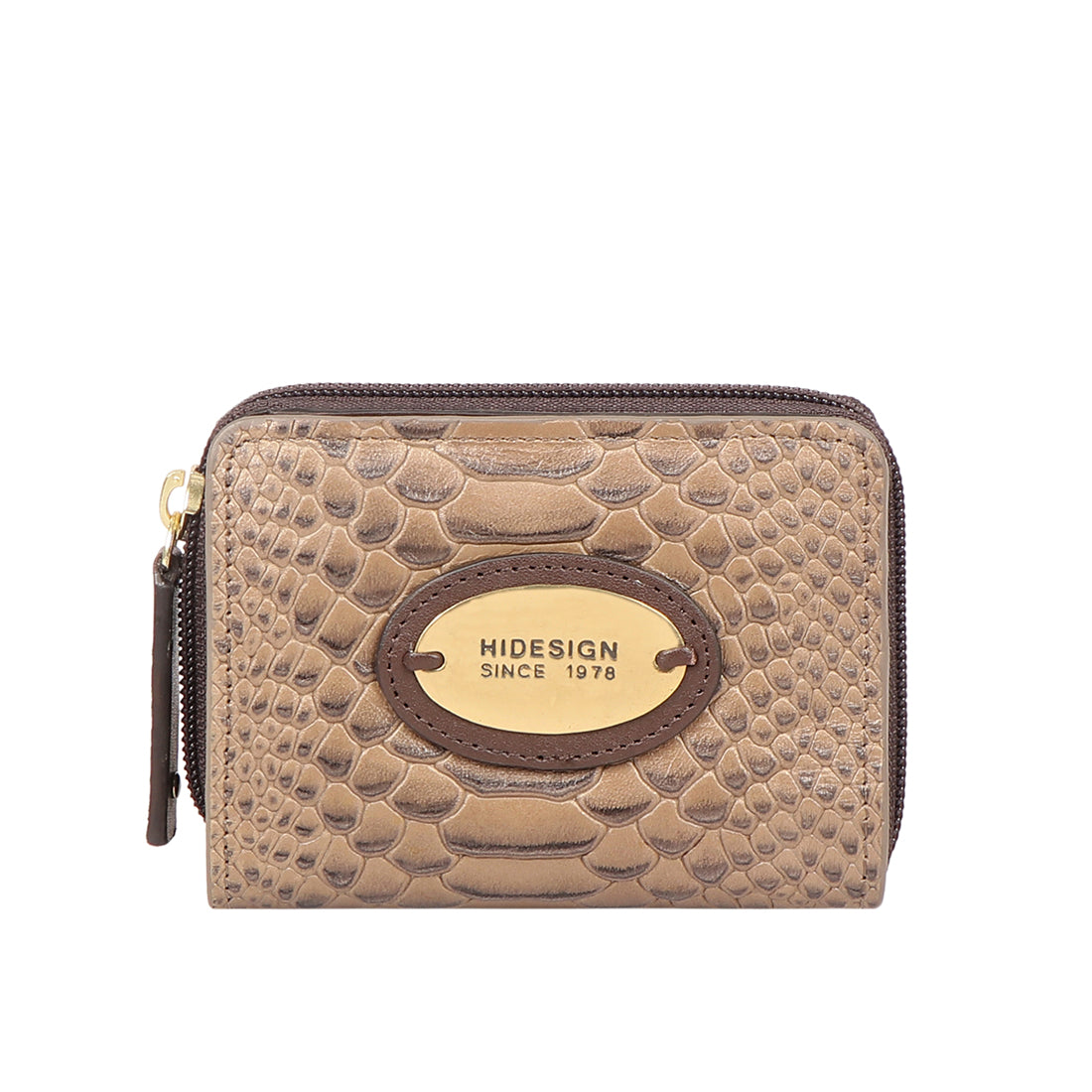 Handcrafted with premium quality snake leather, the Whitney W1 wallet by Hide sign comes with an embossed gold logo and a top zipper detail .